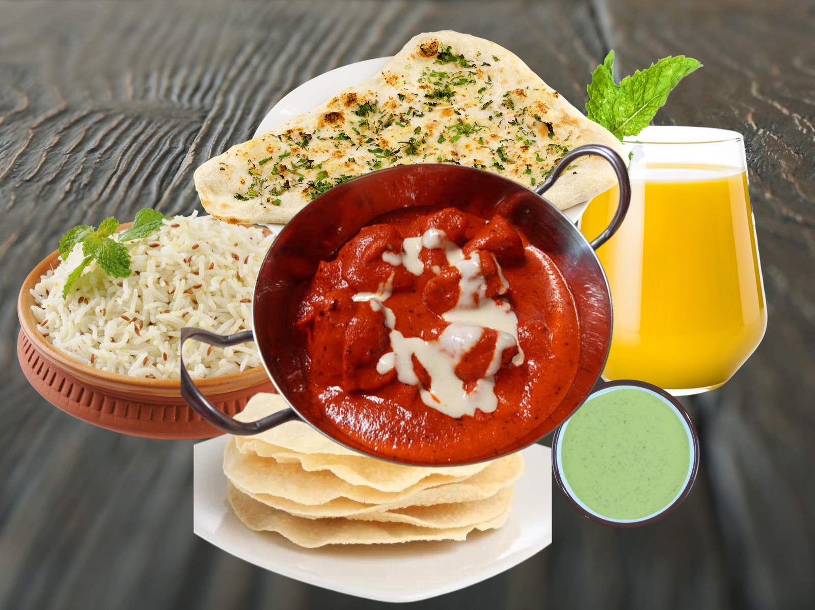 Complete meal — Chicken Tikka Masala with Papadom, Rice, Chutney, Naan and drink of your choice.